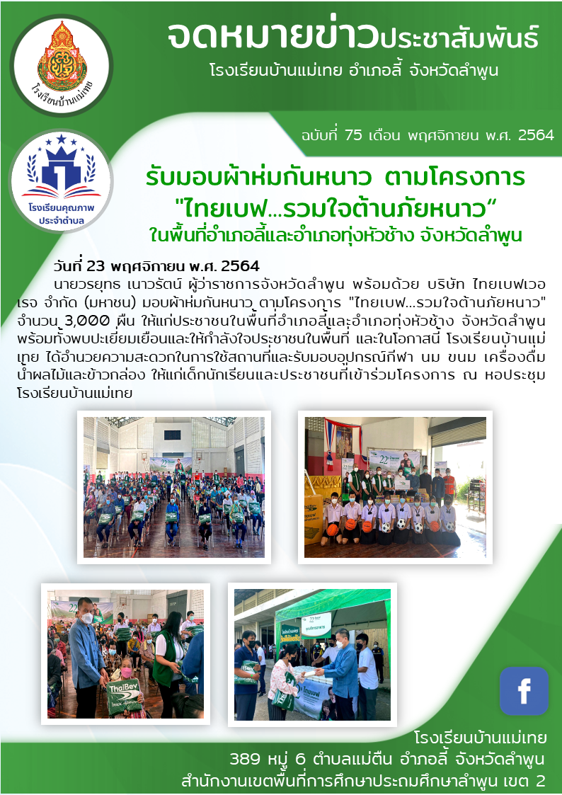วันที่ 23 พฤศจิกายน พ.ศ. 2564 นายวรยุทธ เนาวรัตน์ ผู้ว่าราชการจังหวัดลำพูน พร้อมด้วย บริษัท ไทยเบฟเวอเรจ จำกัด (มหาชน) มอบผ้าห่มกันหนาว ตามโครงการ "ไทยเบฟ...รวมใจต้านภัยหนาว" จำนวน 3,000 ผืน ให้แก่ประชาชนในพื้นที่อำเภอลี้และอำเภอทุ่งหัวช้าง จังหวัดลำพูนพร้อมทั้งพบปะเยี่ยมเยือนและให้กำลังใจประชาชนในพื้นที่ และในโอกาสนี้ โรงเรียนบ้านแม่เทย ได้อำนวยความสะดวกในการใช้สถานที่และรับมอบอุปกรณ์กีฬา นม ขนม เครื่องดื่มน้ำผลไม้และข้าวกล่อง ให้แก่เด็กนักเรียนและประชาชนที่เข้าร่วมโครงการ ณ หอประชุมโรงเรียนบ้านแม่เทย