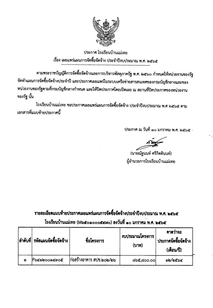ประกาศเผยแพร่แผนการจัดซื้อจัดจ้าง ก่อสร้างอาคาร สปช.202/26 ประจำปีงบประมาณ พ.ศ. 2565