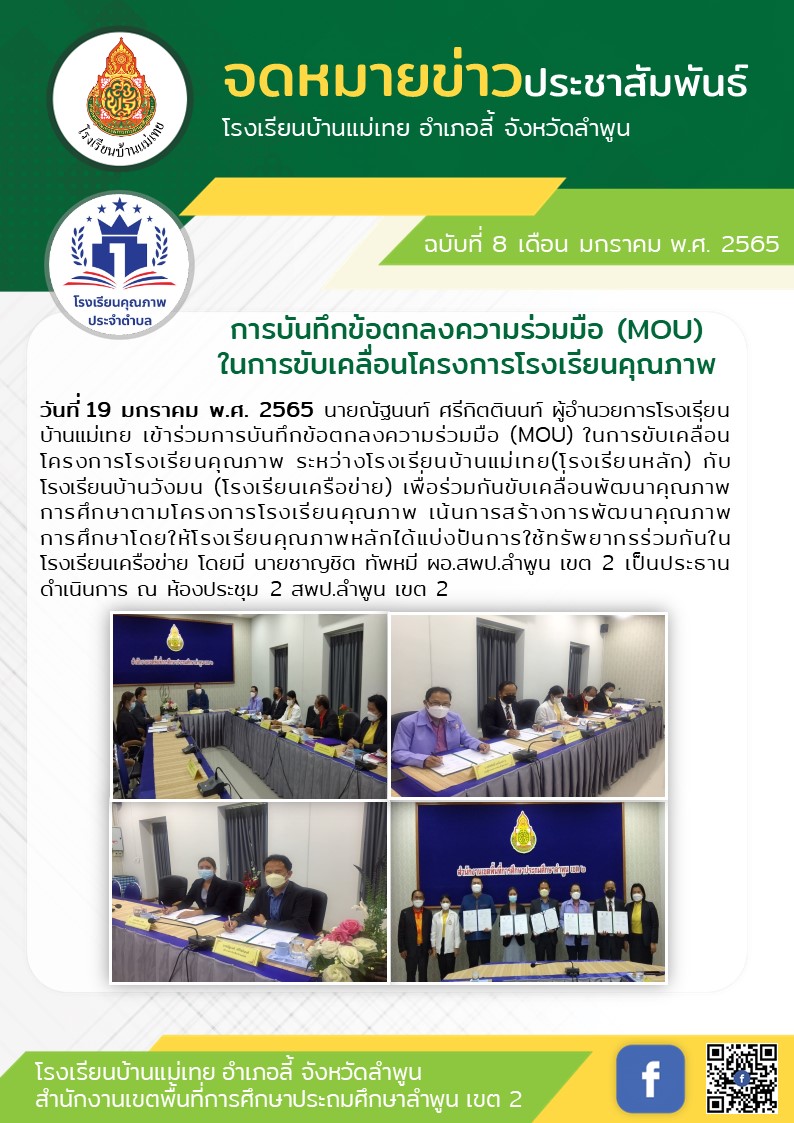 เมื่อ วันที่ 19 มกราคม พ.ศ. 2565 นายณัฐนนท์ ศรีกิตตินนท์ ผู้อำนวยการโรงเรียนบ้านแม่เทย เข้าร่วมการบันทึกข้อตกลงความร่วมมือ (MOU) ในการขับเคลื่อนโครงการโรงเรียนคุณภาพ ระหว่างโรงเรียนบ้านแม่เทย(โรงเรียนหลัก) กับโรงเรียนบ้านวังมน (โรงเรียนเครือข่าย) เพื่อร่วมกันขับเคลื่อนพัฒนาคุณภาพการศึกษาตามโครงการโรงเรียนคุณภาพ เน้นการสร้างการพัฒนาคุณภาพการศึกษาโดยให้โรงเรียนคุณภาพหลักได้แบ่งปันการใช้ทรัพยากรร่วมกันในโรงเรียนเครือข่าย โดยมี นายชาญชิต ทัพหมี ผอ.สพป.ลำพูน เขต 2 เป็นประธานดำเนินการ ณ ห้องประชุม 2 สพป.ลำพูน เขต 2