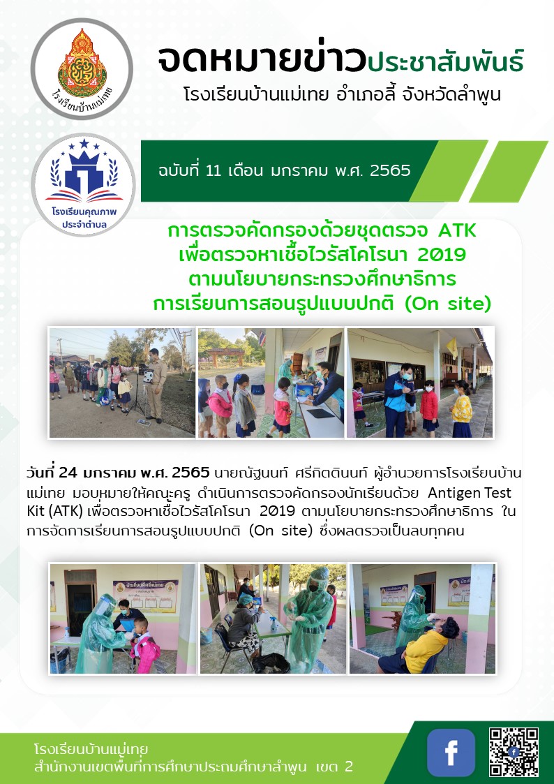 วันที่ 24 มกราคม พ.ศ. 2565 นายณัฐนนท์ ศรีกิตตินนท์ ผู้อำนวยการโรงเรียนบ้านแม่เทย มอบหมายให้คณะครู ดำเนินการตรวจคัดกรองนักเรียนด้วย Antigen Test Kit (ATK) เพื่อตรวจหาเชื้อไวรัสโคโรนา 2019 ตามนโยบายกระทรวงศึกษาธิการ ในการจัดการเรียนการสอนรูปแบบปกติ (On site) ซึ่งผลตรวจเป็นลบทุกคน