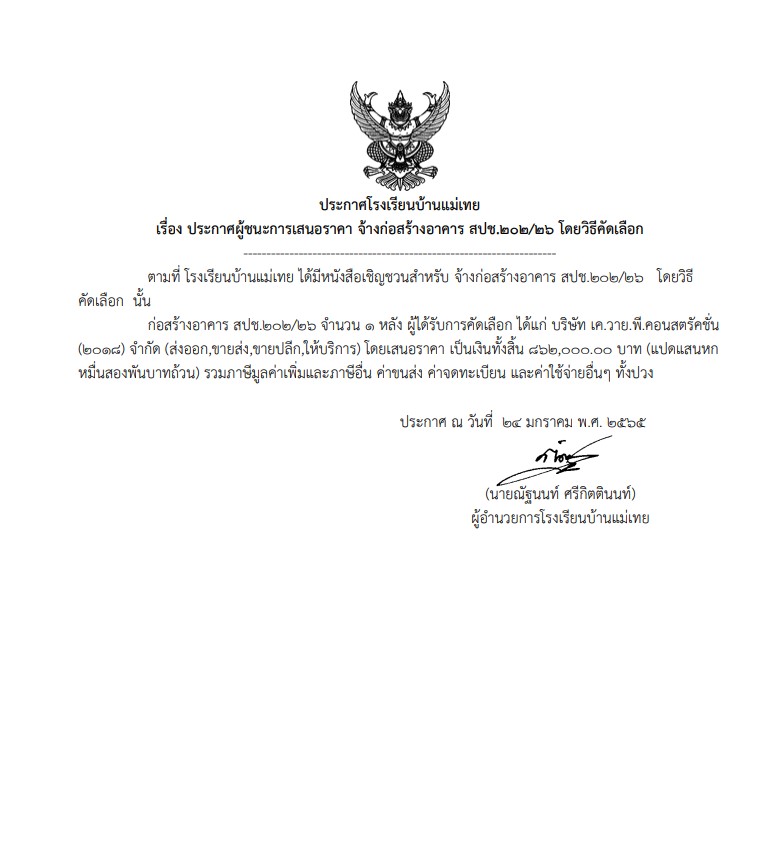 ประกาศผู้ชนะการเสนอราคา จ้างก่อสร้างอาคาร สปช.202/26 โดยวิธีคัดเลือก