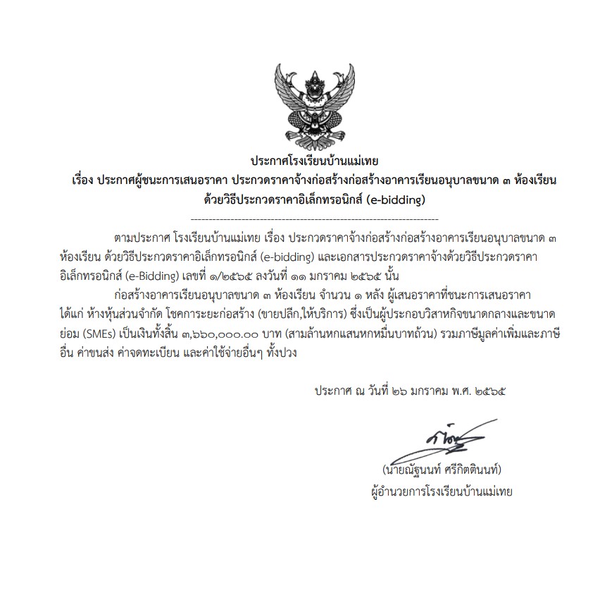 ประกาศผู้ชนะการเสนอราคา ประกวดราคาจ้างก่อสร้างก่อสร้างอาคารเรียนอนุบาลขนาด 3 ห้องเรียน
