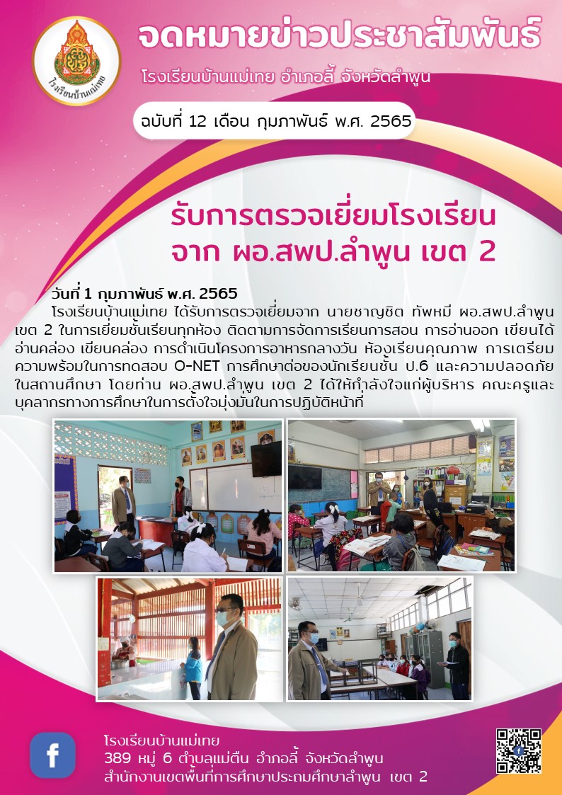 วันที่ 1 กุมภาพันธ์ พ.ศ. 2565 โรงเรียนบ้านแม่เทย ได้รับการตรวจเยี่ยมจาก นายชาญชิต ทัพหมี ผอ.สพป.ลำพูน เขต 2 ในการเยี่ยมชั้นเรียนทุกห้อง ติดตามการจัดการเรียนการสอน การอ่านออก เขียนได้ อ่านคล่อง เขียนคล่อง การดำเนินโครงการอาหารกลางวัน ห้องเรียนคุณภาพ การเตรียมความพร้อมในการทดสอบ O-NET การศึกษาต่อของนักเรียนชั้น ป.6 และความปลอดภัยในสถานศึกษา โดยท่าน ผอ.สพป.ลำพูน เขต 2 ได้ให้กำลังใจแก่ผู้บริหาร คณะครูและบุคลากรทางการศึกษาในการตั้งใจมุ่งมั่นในการปฏิบัติหน้าที่