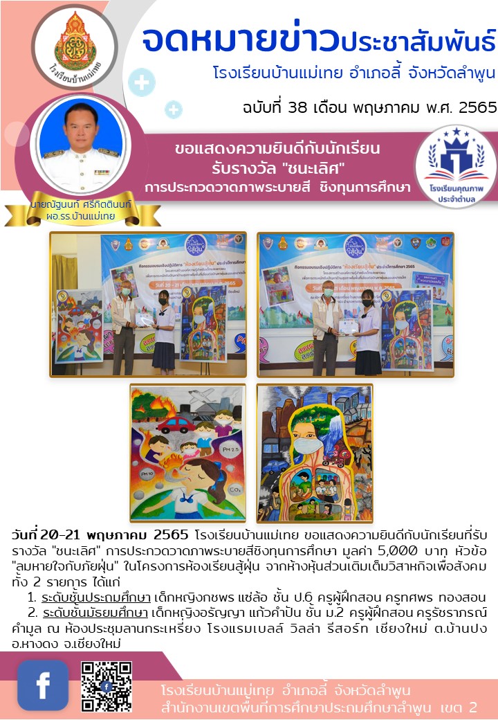 วันที่ 20-21 พฤษภาคม 2565 โรงเรียนบ้านแม่เทย ขอแสดงความยินดีกับนักเรียนที่รับรางวัล "ชนะเลิศ" การประกวดวาดภาพระบายสีชิงทุนการศึกษา มูลค่า 5,000 บาท หัวข้อ "ลมหายใจกับภัยฝุ่น" ในโครงการห้องเรียนสู้ฝุ่น จากห้างหุ้นส่วนเติมเต็มวิสาหกิจเพื่อสังคม ทั้ง 2 รายการ ได้แก่