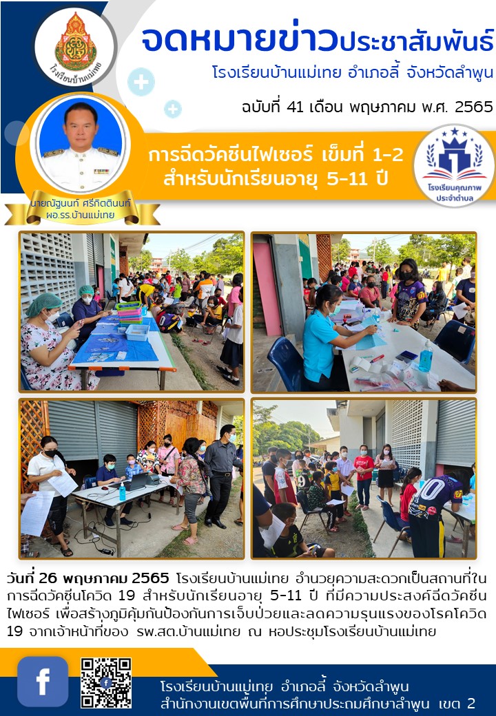 วันที่ 26 พฤษภาคม 2565 โรงเรียนบ้านแม่เทย อำนวยความสะดวกเป็นสถานที่ในการฉีดวัคซีนโควิด 19 สำหรับนักเรียนอายุ 5-11 ปี ที่มีความประสงค์ฉีดวัคซีนไฟเซอร์ เพื่อสร้างภูมิคุ้มกันป้องกันการเจ็บป่วยและลดความรุนแรงของโรคโควิด 19 จากเจ้าหน้าที่ของ รพ.สต.บ้านแม่เทย ณ หอประชุมโรงเรียนบ้านแม่เทย