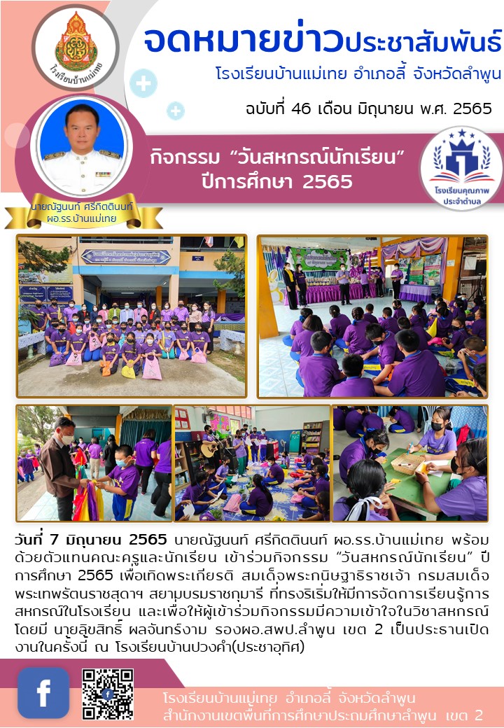 วันที่ 7 มิถุนายน 2565 นายณัฐนนท์ ศรีกิตตินนท์ ผอ.รร.บ้านแม่เทย พร้อมด้วยตัวแทนคณะครูและนักเรียน เข้าร่วมกิจกรรม “วันสหกรณ์นักเรียน” ปีการศึกษา 2565 เพื่อเทิดพระเกียรติ สมเด็จพระกนิษฐาธิราชเจ้า กรมสมเด็จพระเทพรัตนราชสุดาฯ สยามบรมราชกุมารี ที่ทรงริเริ่มให้มีการจัดการเรียนรู้การสหกรณ์ในโรงเรียน และเพื่อให้ผู้เข้าร่วมกิจกรรมมีความเข้าใจในวิชาสหกรณ์ โดยมี นายลิขสิทธิ์ ผลจันทร์งาม รองผอ.สพป.ลำพูน เขต 2 เป็นประธานเปิดงานในครั้งนี้ ณ โรงเรียนบ้านปวงคำ(ประชาอุทิศ)