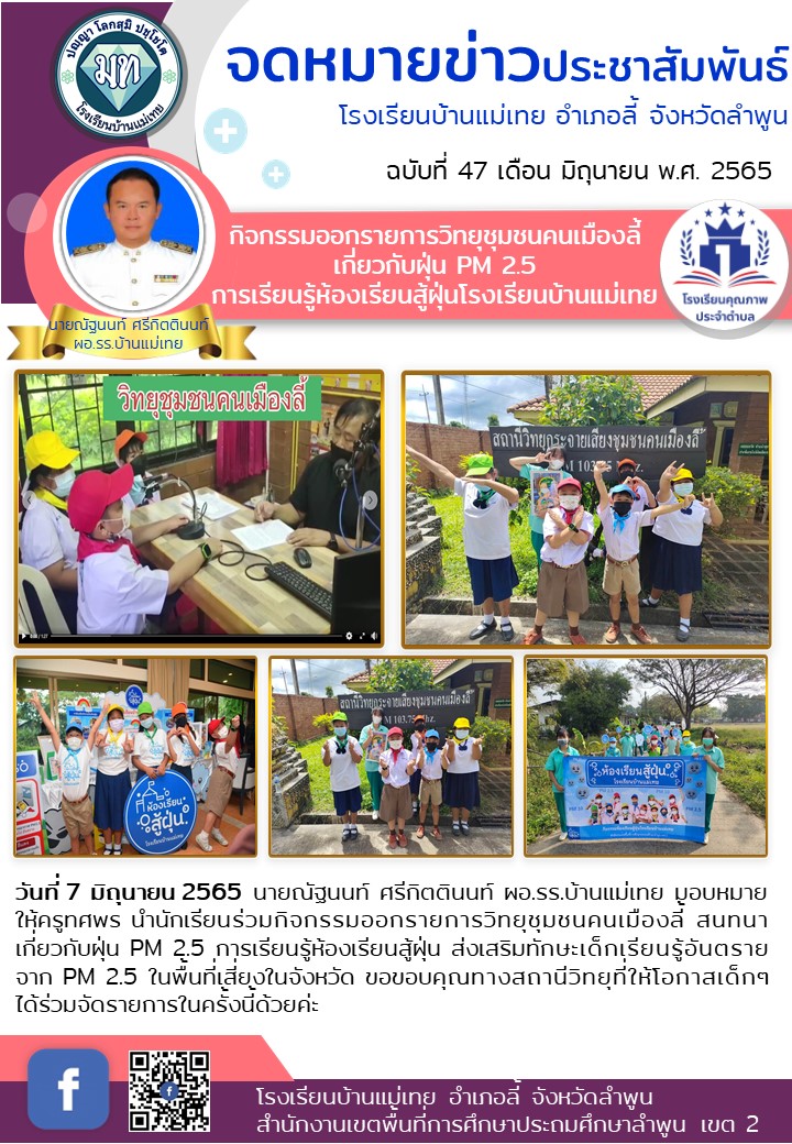 วันที่ 7 มิถุนายน 2565 นายณัฐนนท์ ศรีกิตตินนท์ ผอ.รร.บ้านแม่เทย มอบหมายให้ครูทศพร นำนักเรียนร่วมกิจกรรมออกรายการวิทยุชุมชนคนเมืองลี้ สนทนาเกี่ยวกับฝุ่น PM 2.5 การเรียนรู้ห้องเรียนสู้ฝุ่น ส่งเสริมทักษะเด็กเรียนรู้อันตรายจาก PM 2.5 ในพื้นที่เสี่ยงในจังหวัด ขอขอบคุณทางสถานีวิทยุที่ให้โอกาสเด็กๆ ได้ร่วมจัดรายการในครั้งนี้ด้วยค่ะ