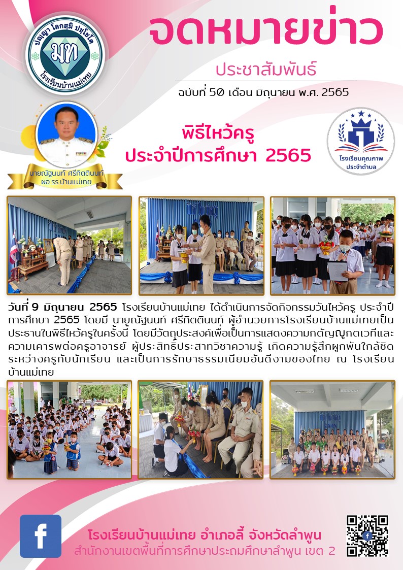 วันที่ 9 มิถุนายน 2565 โรงเรียนบ้านแม่เทย ได้ดำเนินการจัดกิจกรรมวันไหว้ครู ประจำปีการศึกษา 2565 โดยมี นายณัฐนนท์ ศรีกิตตินนท์ ผู้อำนวยการโรงเรียนบ้านแม่เทยเป็นประธานในพิธีไหว้ครูในครั้งนี้ โดยมีวัตถุประสงค์เพื่อเป็นการแสดงความกตัญญูกตเวทีและความเคารพต่อครูอาจารย์ ผู้ประสิทธิ์ประสาทวิชาความรู้ เกิดความรู้สึกผูกพันใกล้ชิดระหว่างครูกับนักเรียน และเป็นการรักษาธรรมเนียมอันดีงามของไทย ณ โรงเรียนบ้านแม่เทย