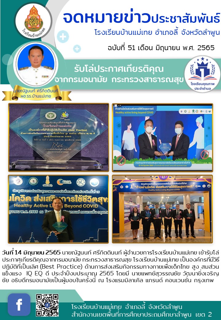 วันที่ 14 มิถุนายน 2565 นายณัฐนนท์ ศรีกิตตินนท์ ผู้อำนวยการโรงเรียนบ้านแม่เทย เข้ารับโล่ประกาศ?เกียรติคุณจากกรมอนามัย? กระทรวงสาธารณสุข? โรงเรียนบ้านแม่เทย เป็นองค์กร?ที่มีวิธี?ปฏิบัติที่เป็นเลิศ (Best Practice)? ด้านการส่งเสริม?กิจกรรม?ทางกายเพื่อเด็กไทย สูง สมส่วน แข็งแรง IQ EQ ดี ประจำปีงบประมาณ? 2565 โดยมี นายแพทย์?สุวรรณ?ชัย วัฒนายิ่งเจริญ?ชัย อธิบดีกรมอนามัยเป็นผู้มอบในครั้งนี้ ณ โรงแรม?มิลาเคิล แกรนด์? คอนเวนชั่น? กรุงเทพ