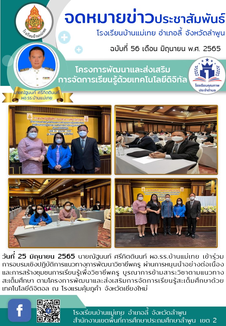 วันที่ 25 มิถุนายน 2565 นายณัฐนนท์ ศรีกิตตินนท์ ผอ.รร.บ้านแม่เทย เข้าร่วมการอบรมเชิงปฏิบัติการแนวทางการพัฒนาวิชาชีพครู ผ่านการหนุนนำอย่างต่อเนื่องและการสร้างชุมชนการเรียนรู้เพื่อวิชาชีพครู บูรณาการข้ามสาระวิชาตามแนวทาง   สะเต็มศึกษา ตามโครงการพัฒนาและส่งเสริมการจัดการเรียนรู้สะเต็มศึกษาด้วยเทคโนโลยีดิจิตอล ณ โรงแรมคุ้มภูคำ จังหวัดเชียงใหม่
