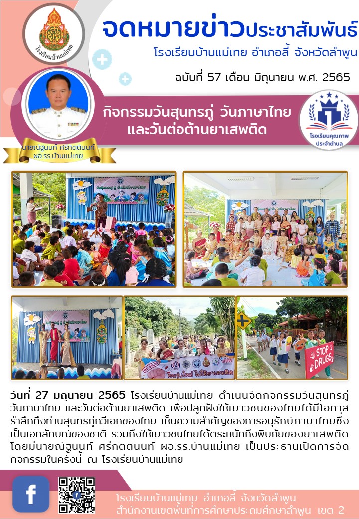 วันที่ 27 มิถุนายน 2565 โรงเรียนบ้านแม่เทย ดำเนินจัดกิจกรรมวันสุนทรภู่ วันภาษาไทย และวันต่อต้านยาเสพติด เพื่อปลูกฝังให้เยาวชนของไทยได้มีโอกาสรำลึกถึงท่านสุนทรภู่กวีเอกของไทย เห็นความสำคัญของการอนุรักษ์ภาษาไทยซึ่งเป็นเอกลักษณ์ของชาติ รวมถึงให้เยาวชนไทยได้ตระหนักถึงพิษภัยของยาเสพติด โดยมีนายณัฐนนท์ ศรีกิตตินนท์ ผอ.รร.บ้านแม่เทย เป็นประธานเปิดการจัดกิจกรรมในครั้งนี้ ณ โรงเรียนบ้านแม่เทย