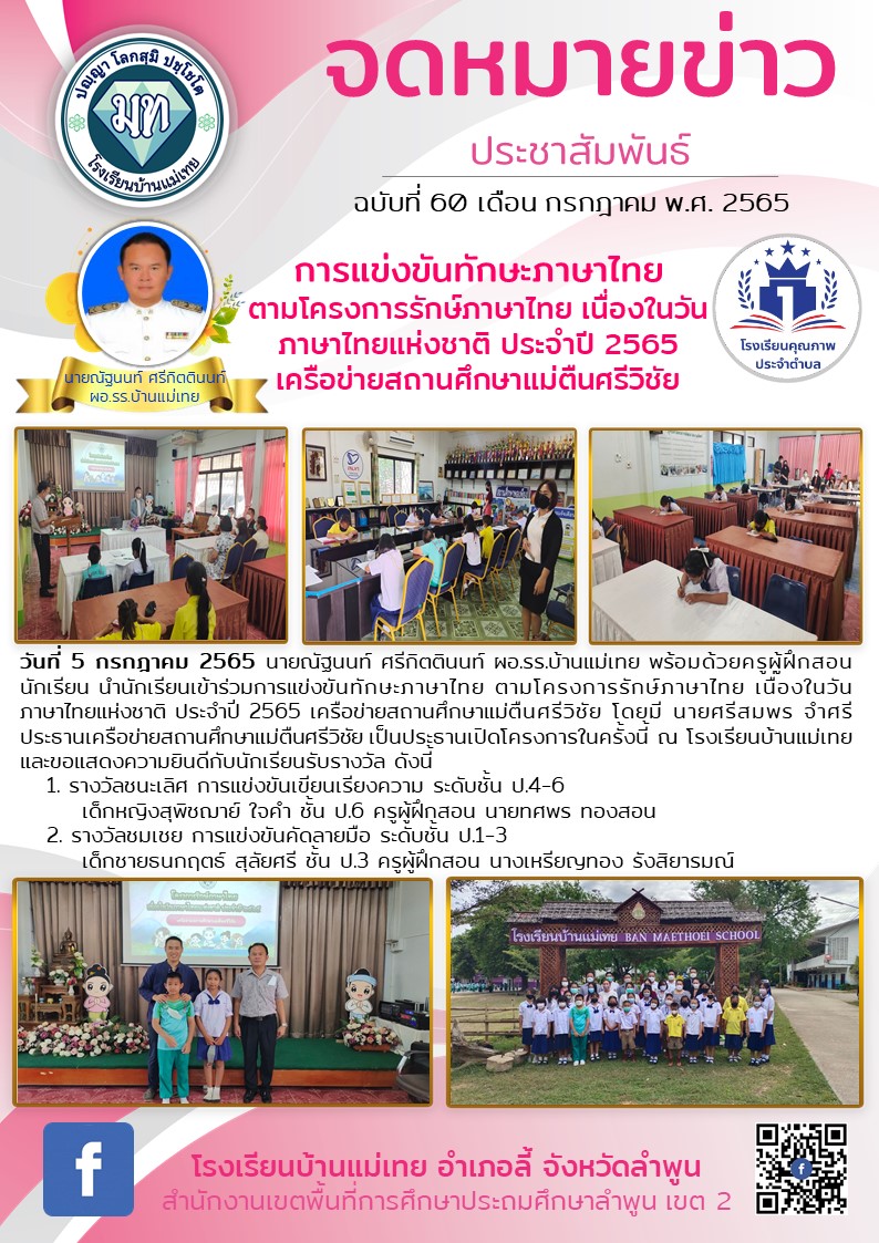 วันที่ 5 กรกฎาคม 2565 นายณัฐนนท์ ศรีกิตตินนท์ ผอ.รร.บ้านแม่เทย พร้อมด้วยครูผู้ฝึกสอนนักเรียน นำนักเรียนเข้าร่วมการแข่งขันทักษะภาษาไทย ตามโครงการรักษ์ภาษาไทย เนื่องในวันภาษาไทยแห่งชาติ ประจำปี 2565 เครือข่ายสถานศึกษาแม่ตืนศรีวิชัย โดยมี นายศรีสมพร จำศรี ประธานเครือข่ายสถานศึกษาแม่ตืนศรีวิชัย เป็นประธานเปิดโครงการในครั้งนี้ ณ โรงเรียนบ้านแม่เทย และขอแสดงความยินดีกับนักเรียนรับรางวัล ดังนี้