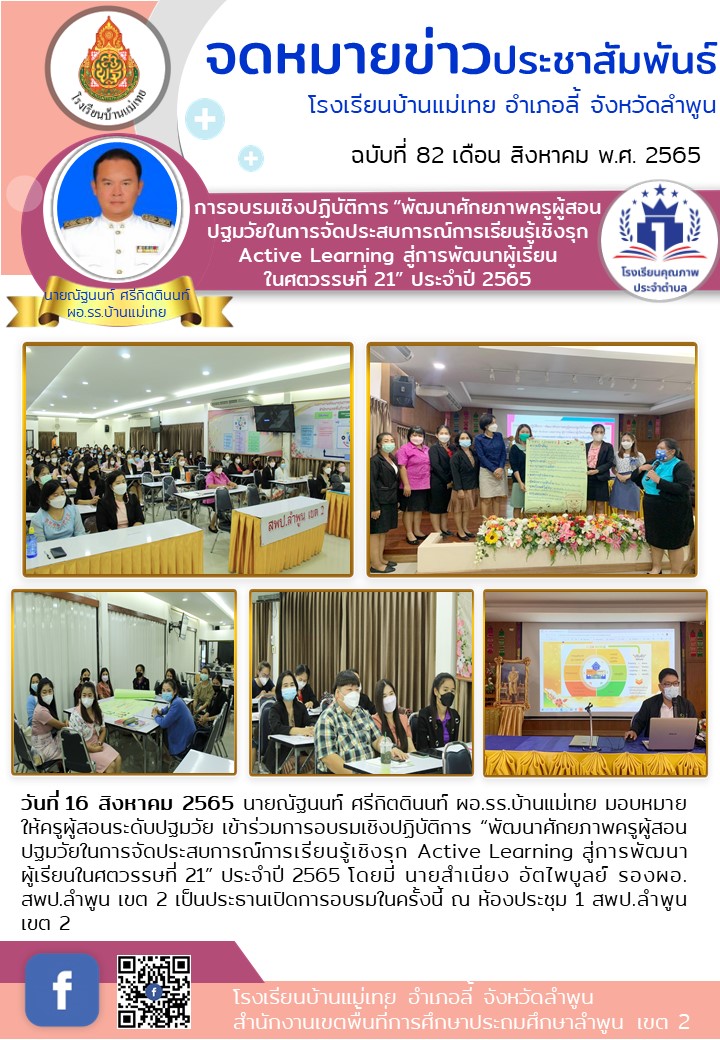 วันที่ 16 สิงหาคม 2565 นายณัฐนนท์ ศรีกิตตินนท์ ผอ.รร.บ้านแม่เทย มอบหมายให้ครูผู้สอนระดับปฐมวัย เข้าร่วมการอบรมเชิงปฏิบัติการ “พัฒนาศักยภาพครูผู้สอนปฐมวัยในการจัดประสบการณ์การเรียนรู้เชิงรุก Active Learning สู่การพัฒนาผู้เรียนในศตวรรษที่ 21” ประจำปี 2565 โดยมี นายสำเนียง อัตไพบูลย์ รองผอ.สพป.ลำพูน เขต 2 เป็นประธานเปิดการอบรมในครั้งนี้ ณ ห้องประชุม 1 สพป.ลำพูน เขต 2