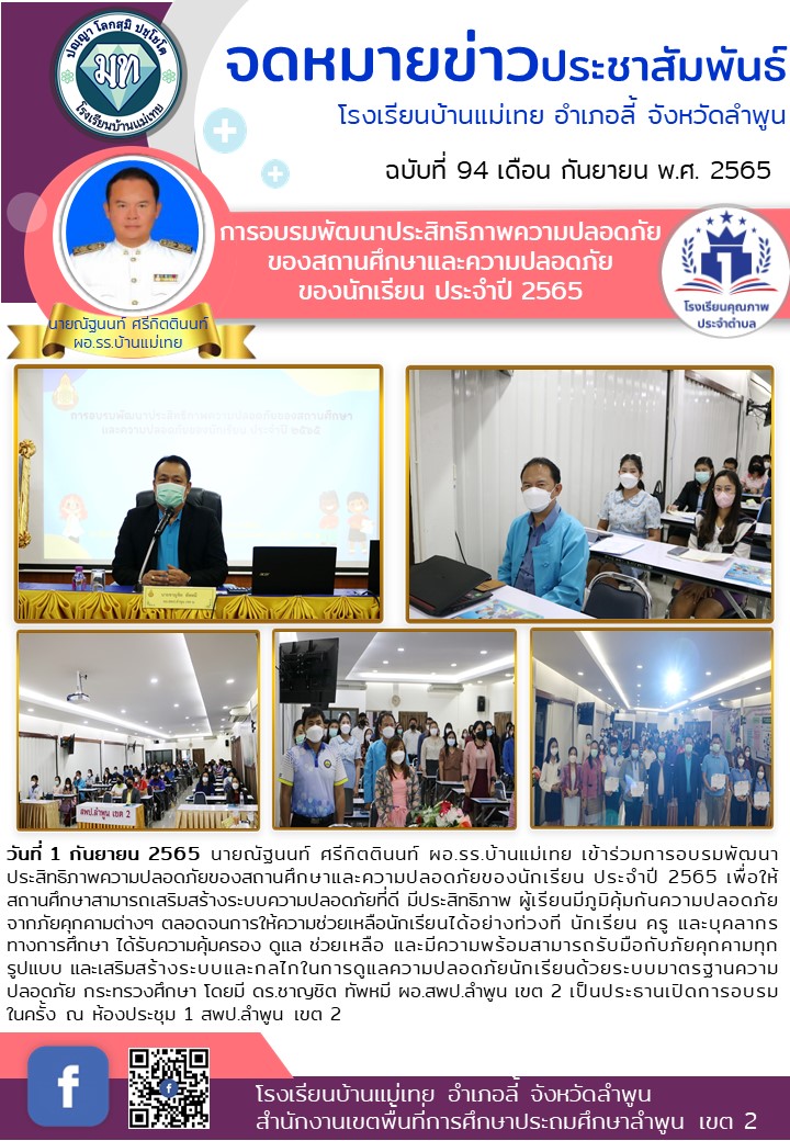วันที่ 1 กันยายน 2565 นายณัฐนนท์ ศรีกิตตินนท์ ผอ.รร.บ้านแม่เทย เข้าร่วมการอบรมพัฒนาประสิทธิภาพความปลอดภัยของสถานศึกษาและความปลอดภัยของนักเรียน ประจำปี 2565 เพื่อให้สถานศึกษาสามารถเสริมสร้างระบบความปลอดภัยที่ดี มีประสิทธิภาพ ผู้เรียนมีภูมิคุ้มกันความปลอดภัยจากภัยคุกคามต่างๆ ตลอดจนการให้ความช่วยเหลือนักเรียนได้อย่างท่วงที นักเรียน ครู และบุคลากรทางการศึกษา ได้รับความคุ้มครอง ดูแล ช่วยเหลือ และมีความพร้อมสามารถรับมือกับภัยคุกคามทุกรูปแบบ และเสริมสร้างระบบและกลไกในการดูแลความปลอดภัยนักเรียนด้วยระบบมาตรฐานความปลอดภัย กระทรวงศึกษา โดยมี ดร.ชาญชิต ทัพหมี ผอ.สพป.ลำพูน เขต 2 เป็นประธานเปิดการอบรมในครั้ง ณ ห้องประชุม 1 สพป.ลำพูน เขต 2