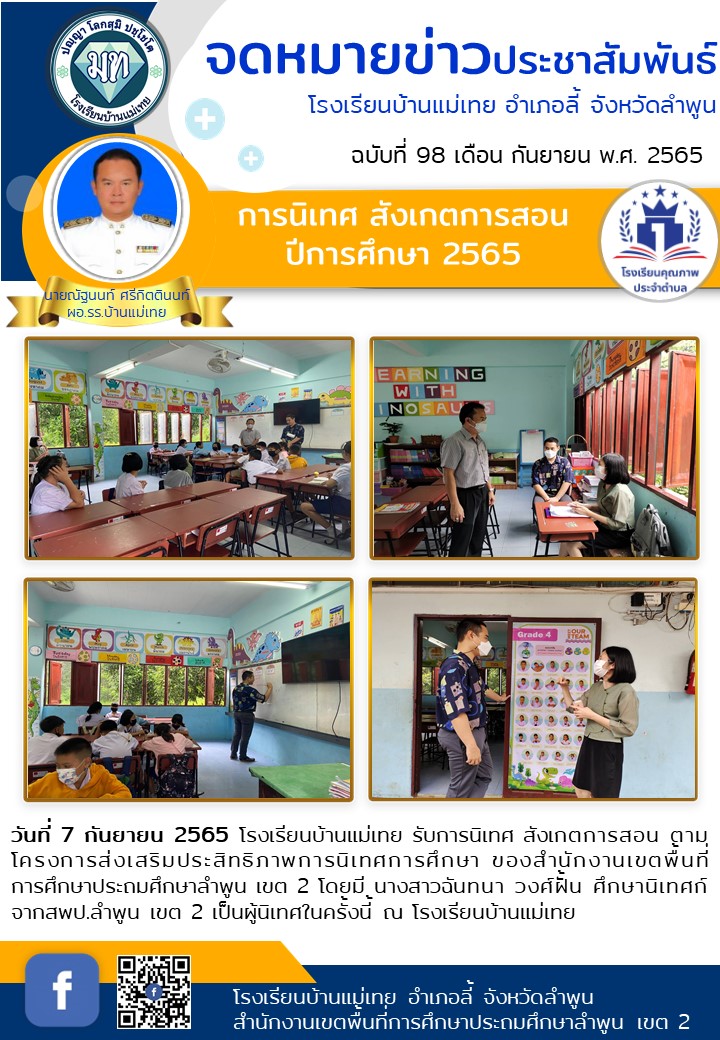 วันที่ 7 กันยายน 2565 โรงเรียนบ้านแม่เทย รับการนิเทศ สังเกตการสอน ตามโครงการส่งเสริมประสิทธิภาพการนิเทศการศึกษา ของสำนักงานเขตพื้นที่การศึกษาประถมศึกษาลำพูน เขต 2 โดยมี นางสาวฉันทนา วงศ์ฝั้น ศึกษานิเทศก์ จากสพป.ลำพูน เขต 2 เป็นผู้นิเทศในครั้งนี้ ณ โรงเรียนบ้านแม่เทย
