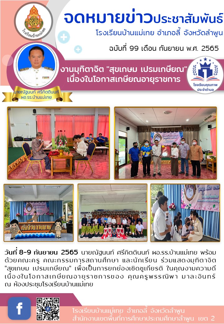 วันที่ 8-9 กันยายน 2565 นายณัฐนนท์ ศรีกิตตินนท์ ผอ.รร.บ้านแม่เทย พร้อมด้วยคณะครู คณะกรรมการสถานศึกษา และนักเรียน ร่วมแสดงมุทิตาจิต "สุขเกษม เปรมเกษียณ" เพื่อเป็นการยกย่องเชิดชูเกียรติ ในคุณงามความดี เนื่องในโอกาสเกษียณอายุราชการของ คุณครูพรรณิพา มาละอินทร์ ณ ห้องประชุมโรงเรียนบ้านแม่เทย
