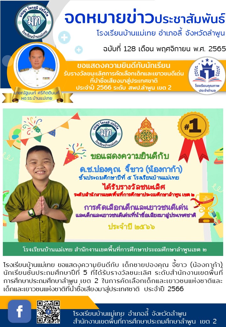 โรงเรียนบ้านแม่เทย ขอแสดงความยินดีกับ เด็กชายปองคุณ จี้ขาว (น้องกาก้า) นักเรียนชั้นประถมศึกษาปีที่ 5 ที่ได้รับรางวัลชนะเลิศ ระดับสำนักงานเขตพื้นที่การศึกษาประถมศึกษาลำพูน เขต 2 ในการคัดเลือกเด็กและเยาวชนแห่งชาติและเด็กและเยาวชนแห่งชาติที่นำชื่อเสียงมาสู่ประเทศชาติ ประจำปี 2566