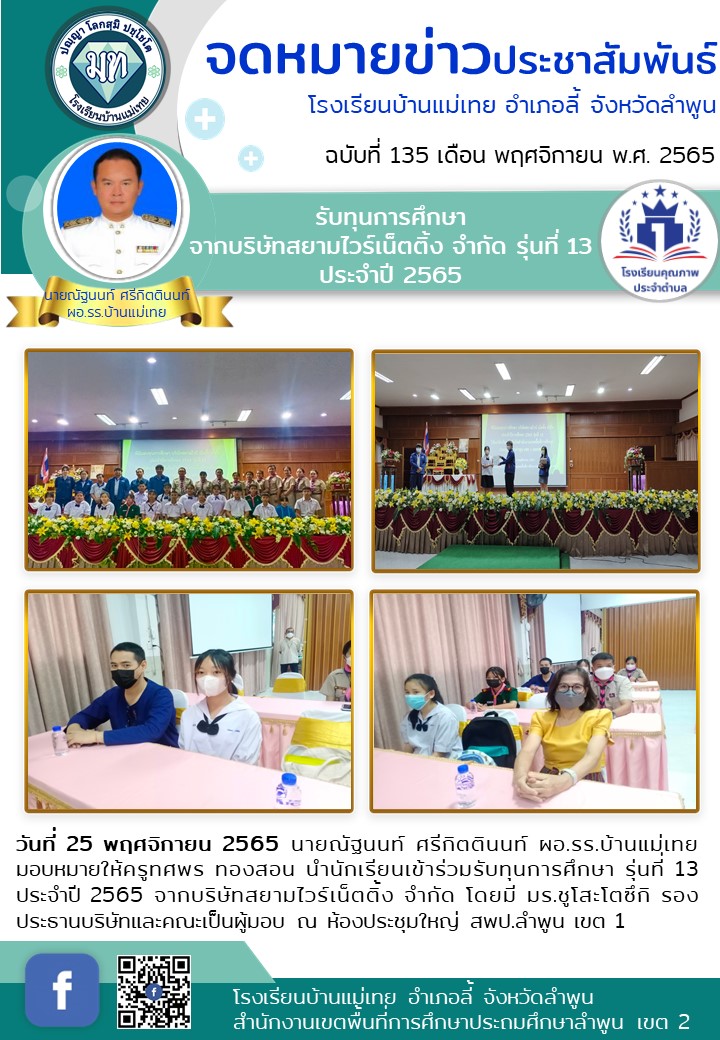 วันที่ 25 พฤศจิกายน 2565 นายณัฐนนท์ ศรีกิตตินนท์ ผอ.รร.บ้านแม่เทย มอบหมายให้ครูทศพร ทองสอน นำนักเรียนเข้าร่วมรับทุนการศึกษา รุ่นที่ 13 ประจำปี 2565 จากบริษัทสยามไวร์เน็ตติ้ง จำกัด โดยมี มร.ชูโสะโตซึกิ รองประธานบริษัทและคณะเป็นผู้มอบ ณ ห้องประชุมใหญ่ สพป.ลำพูน เขต 1
