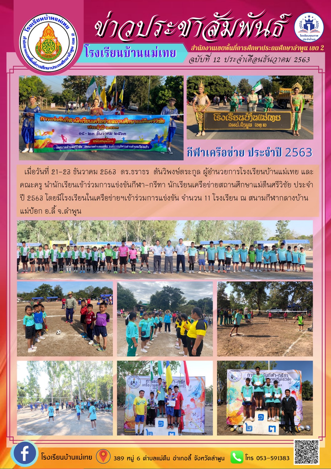 เมื่อวันที่ 21-23 ธันวาคม 2563 ดร.ธราธร ตันวิพงษ์ตระกูล ผู้อำนวยการโรงเรียนบ้านแม่เทยและคณะครู นำนักเรียนเข้าร่วมการแข่งขันกีฬา-กีฑา นักเรียนเครือข่ายสถานศึกษาแม่ตืนศรีวิชัย ประจำปี 2563 โดยมีโรงเรียนในเครือข่ายสถานศึกษาฯเข้าร่วมการแข่งขัน จำนวน 11 โรงเรียน ณ สนามกีฬากลางบ้านแม่ป้อก อำเภอลี้ จังหวัดลำพูน
