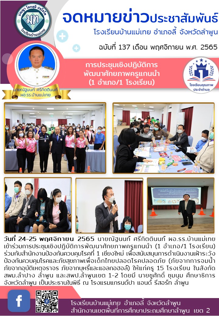 วันที่ 24-25 พฤศจิกายน 2565 นายณัฐนนท์ ศรีกิตตินนท์ ผอ.รร.บ้านแม่เทย เข้าร่วมการประชุมเชิงปฏิบัติการพัฒนาศักยภาพครูแกนนำ (1 อำเภอ/1 โรงเรียน) ร่วมกับสำนักงานป้องกันควบคุมโรคที่ 1 เชียงใหม่ เพื่อสนับสนุนการดำเนินงานเฝ้าระวังป้องกันควบคุมโรคและภัยสุขภาพเพื่อเด็กไทยปลอดโรคปลอดภัย (ภัยจากการจมน้ำ ภัยจากอุบัติเหตุจราจร ภัยจากบุหรี่และแอลกอฮอล์) ให้แก่ครู 15 โรงเรียน ในสังกัด สพม.ลำปาง ลำพูน และสพป.ลำพูนเขต 1-2 โดยมี นายชูศักดิ์ ชุมนุม ศึกษาธิการจังหวัดลำพูน เป็นประธานในพิธี ณ โรงแรมแกรนด์ปา แอนด์ รีสอร์ท ลำพูน