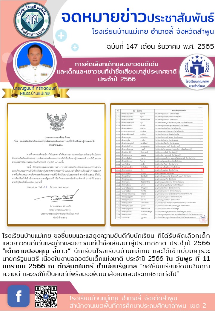 โรงเรียนบ้านแม่เทย ขอชื่นชมและแสดงความยินดีกับนักเรียน ที่ได้รับคัดเลือกเด็กและเยาวชนดีเด่นและเด็กและเยาวชนที่นำชื่อเสียงมาสู่ประเทศชาติ ประจำปี 2566 “เด็กชายปองคุณ จี้ขาว” นักเรียนโรงเรียนบ้านแม่เทย และได้เข้าเยี่ยมคารวะนายกรัฐมนตรี เนื่องในงานฉลองวันเด็กแห่งชาติ ประจำปี 2566 ใน วันพุธ ที่ 11 มกราคม 2566 ณ ตึกสันติไมตรี ทำเนียบรัฐบาล “ขอให้นักเรียนยึดมั่นในคุณความดี และขอให้เป็นคนดีที่พร้อมจะพัฒนาสังคมและประเทศชาติต่อไป”