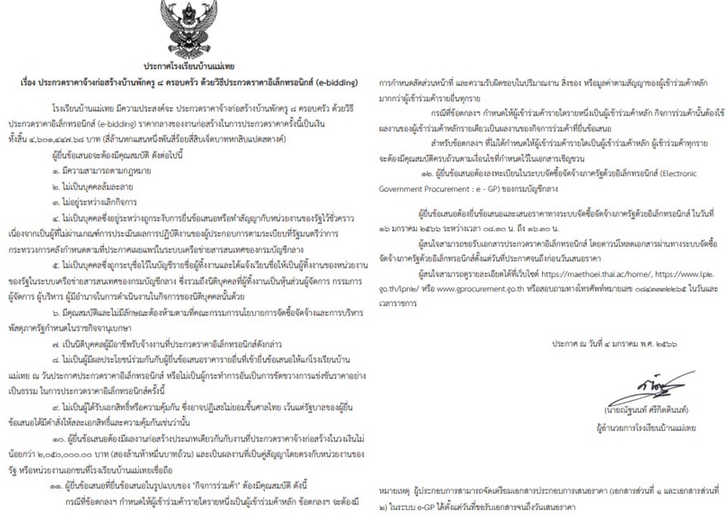 ประกาศโรงเรียนบ้านแม่เทย เรื่อง ประกวดราคาจ้างก่อสร้างบ้านพักครู 8 ครอบครัว ด้วยวิธีประกวดราคาอิเล็กทรอนิกส์ (e-bidding) หรือสอบถามโทรศัพท์หมายเลข 084-3332265
