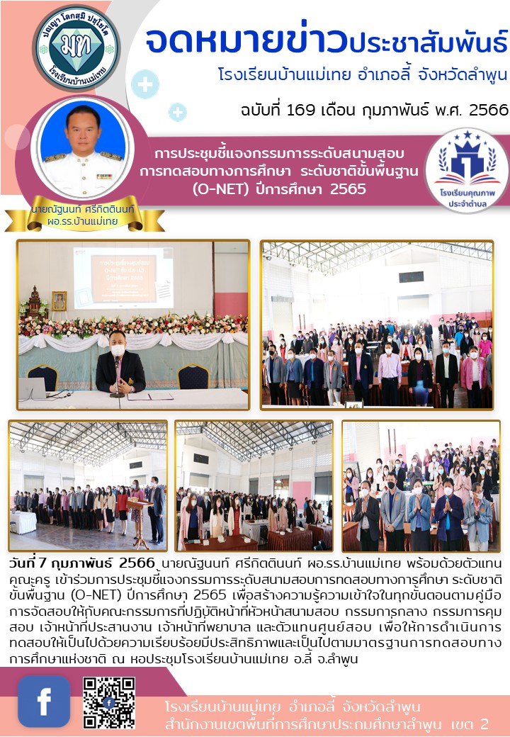 วันที่ 7 กุมภาพันธ์ 2566 นายณัฐนนท์ ศรีกิตตินนท์ ผอ.รร.บ้านแม่เทย พร้อมด้วยตัวแทนคณะครูเข้าร่วมการประชุมชี้แจงกรรมการระดับสนามสอบการทดสอบทางการศึกษา ระดับชาติขั้นพื้นฐาน (O-NET : Ordinary National Educational Test) ปีการศึกษา 2565 เพื่อสร้างความรู้ความเข้าใจในทุกขั้นตอนตามคู่มือการจัดสอบให้กับคณะกรรมการที่ปฏิบัติหน้าที่หัวหน้าสนามสอบ กรรมการกลาง กรรมการคุมสอบ เจ้าหน้าที่ประสานงาน เจ้าหน้าที่พยาบาล และตัวแทนศูนย์สอบ เพื่อให้การดำเนินการทดสอบให้เป็นไปด้วยความเรียบร้อยมีประสิทธิภาพและเป็นไปตามมาตรฐานการทดสอบทางการศึกษาแห่งชาติ ณ หอประชุมโรงเรียนบ้านแม่เทย อ.ลี้ จ.ลำพูน