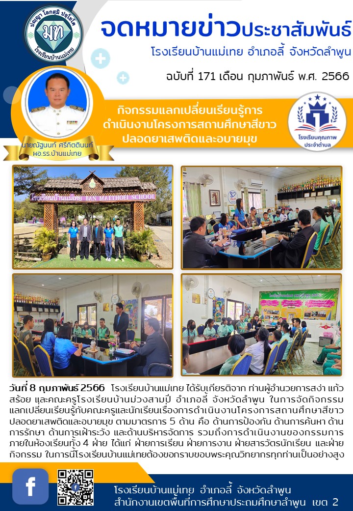 วันที่ 8 กุมภาพันธ์ 2566 โรงเรียนบ้านแม่เทย ได้รับเกียรติจาก ท่านผู้อำนวยการสง่า แก้วสร้อย และคณะครูโรงเรียนบ้านม่วงสามปี อำเภอลี้ จังหวัดลำพูน ในการจัดกิจกรรมแลกเปลี่ยนเรียนรู้กับคณะครูและนักเรียนเรื่องการดำเนินงานโครงการสถานศึกษาสีขาว ปลอดยาเสพติดและอบายมุข ตามมาตรการ 5 ด้าน คือ ด้านการป้องกัน ด้านการค้นหา ด้านการรักษา ด้านการเฝ้าระวัง และด้านบริหารจัดการ รวมถึงการดำเนินงานของกรรมการภายในห้องเรียนทั้ง 4 ฝ่าย ได้แก่ ฝ่ายการเรียน ฝ่ายการงาน ฝ่ายสารวัตรนักเรียน และฝ่ายกิจกรรม ในการนี้โรงเรียนบ้านแม่เทยต้องขอกราบขอบพระคุณวิทยากรทุกท่านเป็นอย่างสูง
