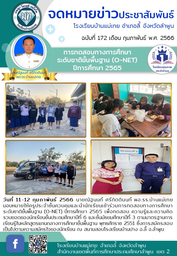 วันที่ 11-12 กุมภาพันธ์ 2566 นายณัฐนนท์ ศรีกิตตินนท์ ผอ.รร.บ้านแม่เทย มอบหมายให้ครูประจำชั้นควบคุมและนำนักเรียนเข้าร่วมการทดสอบทางการศึกษา ระดับชาติขั้นพื้นฐาน (O-NET) ปีการศึกษา 2565 เพื่อทดสอบ ความรู้และความคิดรวบยอดของนักเรียนชั้นประถมศึกษาปีที่ 6 และชั้นมัธยมศึกษาปีที่ 3 ตามมาตรฐานการเรียนรู้ในหลักสูตรแกนกลางการศึกษาขั้นพื้นฐาน พุทธศักราช 2551 ซึ่งการสมัครสอบเป็นไปตามความสมัครใจของนักเรียน ณ สนามสอบโรงเรียนบ้านปาง อ.ลี้ จ.ลำพูน