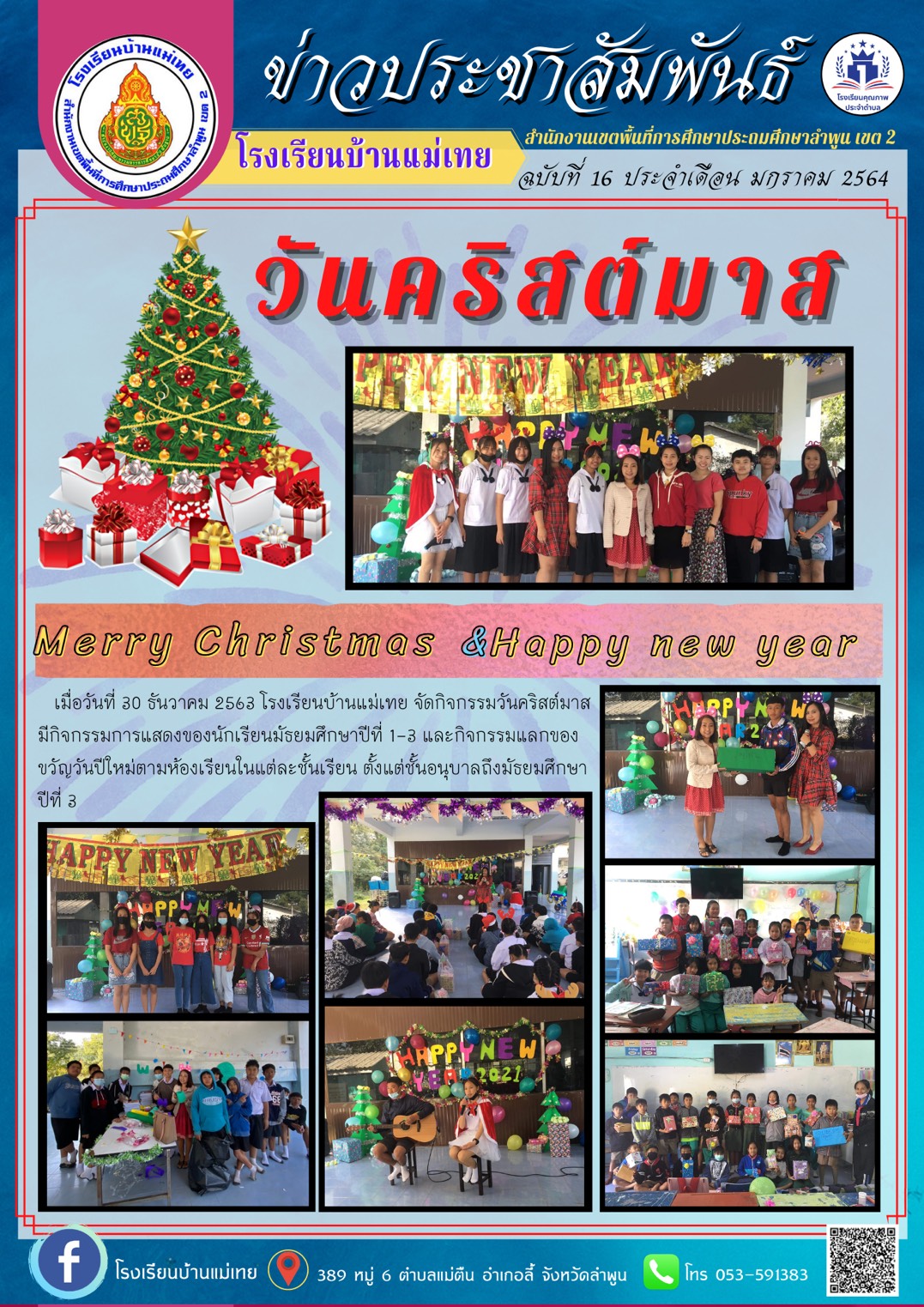 วันที่ 30 ธันวาคม 2563 โรงเรียนบ้านแม่เทย จัดกิจกรรมวันคริสต์มาสมีกิจกรรมการแสดงของนักเรียนชั้นมัธยมศึกษาปีที่ 1-3 และกิจกรรมแลกของขวัญวันขึ้นปีใหม่ 2564 ตามห้องเรียนในแต่ละชั้นเรียน ตั้งแต่ชั้นอนุบาลถึงมัธยมศึกษาปีที่ 3
