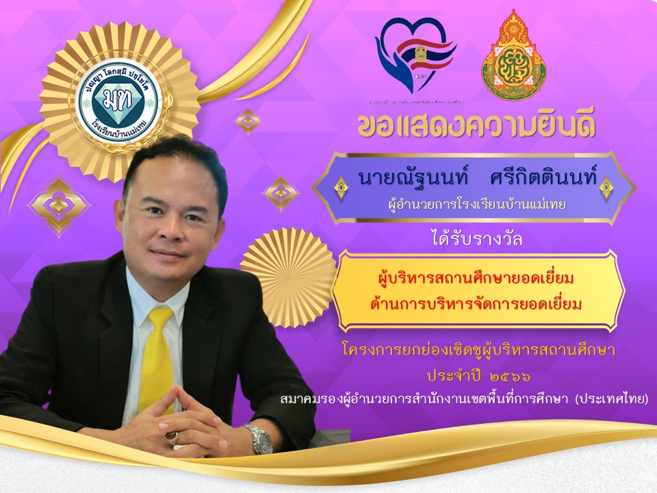 ขอแสดงความยินดี กับ ผอ.ณัฐนนท์ ศรีกิตตินนท์ ผู้อำนวยการโรงเรียนบ้านแม่เทย ที่ได้รับรางวัลผู้บริหารสถานศึกษายอดเยี่ยม ด้านการบริหารจัดการยอดเยี่ยม