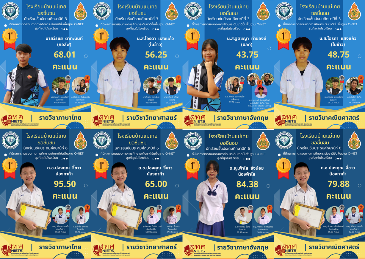 3. โรงเรียนบ้านแม่เทย ขอชื่นชมนักเรียนชั้นมัธยมศึกษาปีที่ 3 และชั้นประถมศึกษาปีที่ 6 ปีการศึกษา 2566 ที่มีผลการทดสอบทางการศึกษาระดับชาติขั้นพื้นฐาน O-NET สูงที่สุดในโรงเรียน