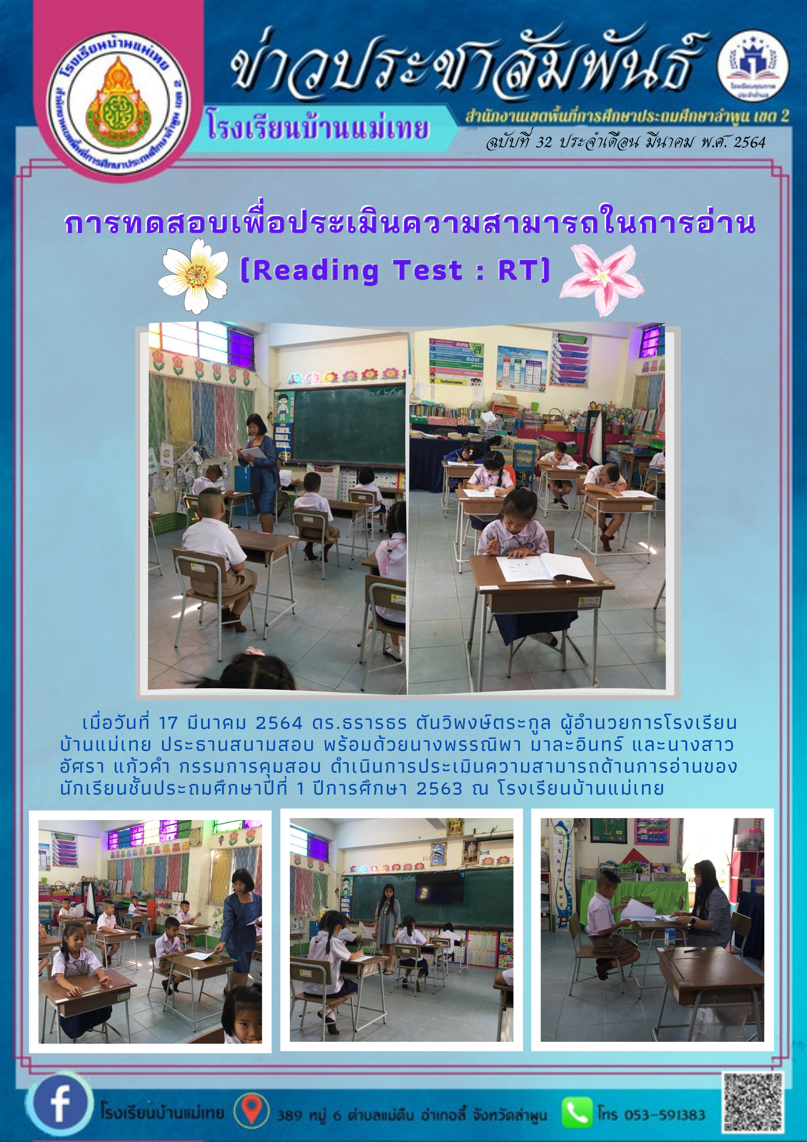 เมื่อวันที่ 17 มีนาคม 2564 ดร.ธรารธร ตันวิพงษ์ตระกูล ผู้อำนวยการโรงเรียนบ้านแม่เทย ประธานสนามสอบ พร้อมด้วยนางพรรณิพา มาละอินทร์ และนางสาวอัศรา แก้วคำ กรรมการคุมสอบ ดำเนินการประเมินความสามารถด้านการอ่านของนักเรียนชั้นประถมศึกษาปีที่ 1 ปีการศึกษา 2563 ณ โรงเรียนบ้านแม่เทย