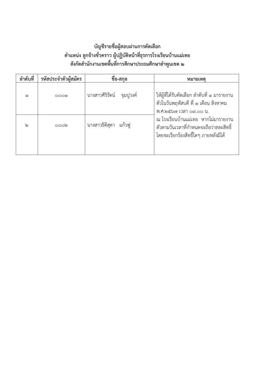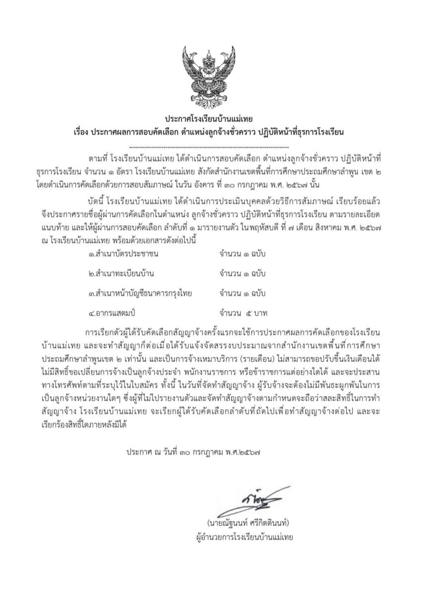 ขอให้ผู้ผ่านการสอบคัดเลือก ลำดับที่ 1 มารายงานตัว ในวันพฤหัสบดี ที่ 1 เดือน สิงหาคม พ.ศ. 2567 ณ โรงเรียนบ้านแม่เทย พร้อมด้วยเอกสารตามประกาศ