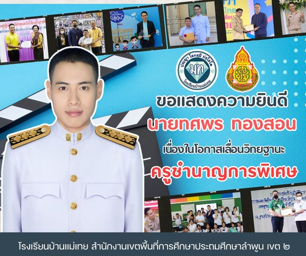ขอแสดงความยินดี กับคุณครูทศพร ทองสอน เนื่องในโอกาสได้เลื่อนวิทยฐานะเป็น ครูชำนาญการพิเศษ โรงเรียนบ้านแม่เทย