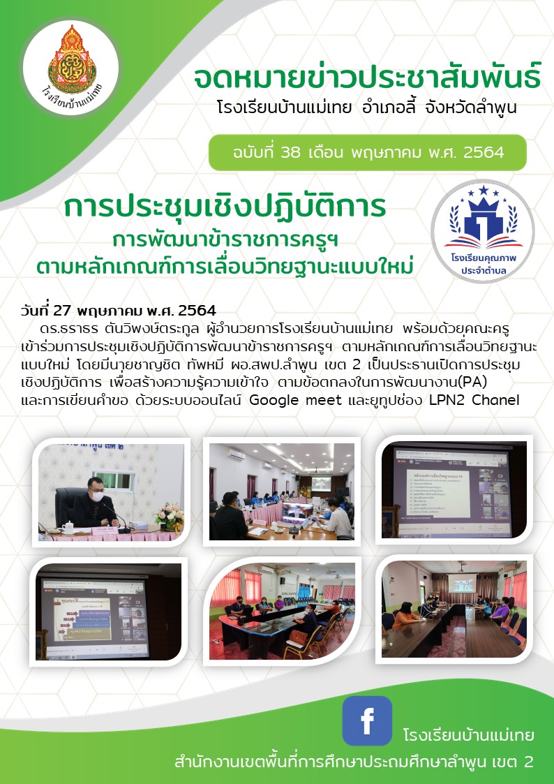 ดร.ธราธร ตันวิพงษ์ตระกูล ผู้อำนวยการโรงเรียนบ้านแม่เทย พร้อมด้วยคณะครู เข้าร่วมการประชุมเชิงปฏิบัติการพัฒนาข้าราชการครูฯ ตามหลักเกณฑ์การเลื่อนวิทยฐานะแบบใหม่ โดยมีนายชาญชิต ทัพหมี ผอ.สพป.ลำพูน เขต 2 เป็นประธานเปิดการประชุมเชิงปฏิบัติการ เพื่อสร้างความรู้ความเข้าใจ ตามข้อตกลงในการพัฒนางาน(PA) และการเขียนคำขอ ด้วยระบบออนไลน์ Google meet และยูทูปช่อง LPN2 Chanel