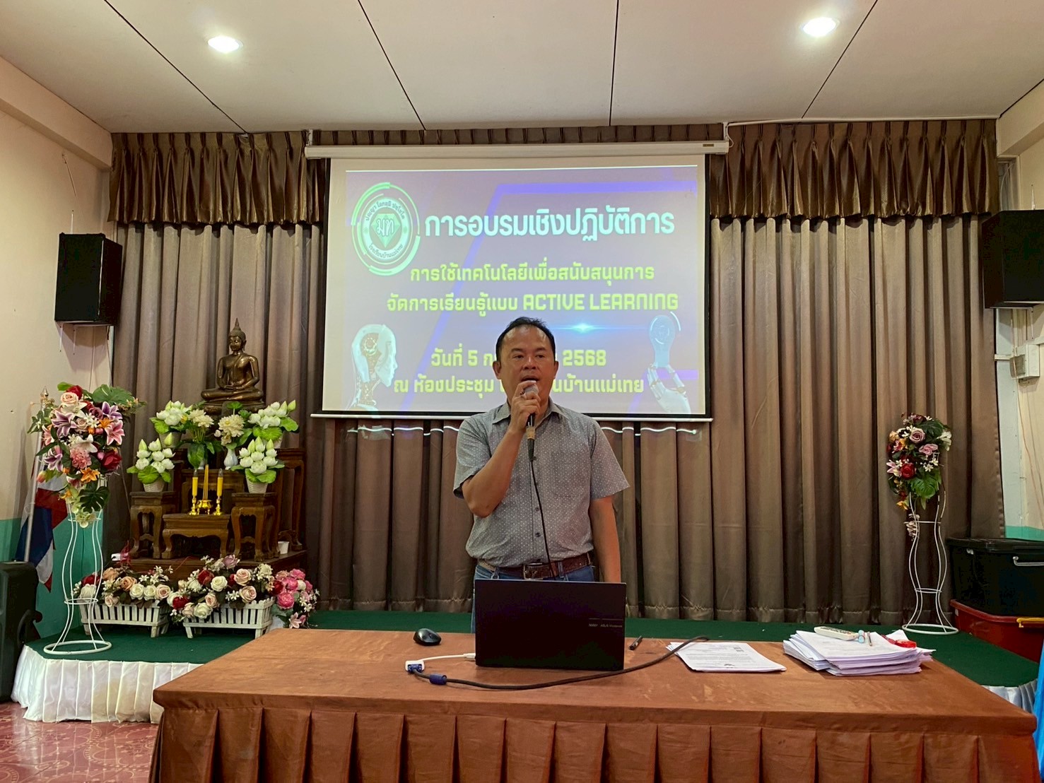 เมื่อวันที่ 5 กรกฎาคม 2568 ผอ.ณัฐนนท์ ศรีกิตตินนท์ พร้อมด้วยคณะครู และบุคลากรทางการศึกษา โรงเรียนบ้านแม่เทย ได้เข้าร่วมการอบรมเชิงปฏิบัติการ หัวข้อ "การใช้เทคโนโลยีเพื่อสนับสนุนการจัดการเรียนรู้แบบ Active Learning" ณ ห้องประชุม โรงเรียนบ้านแม่เทย