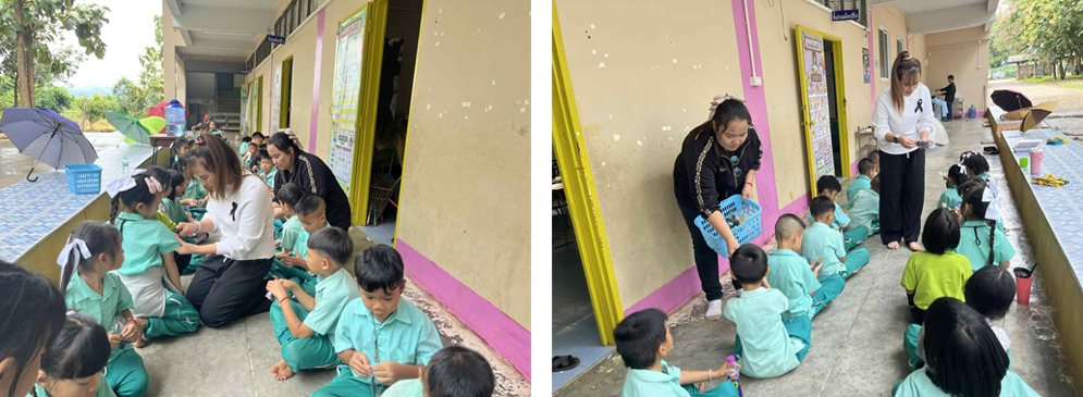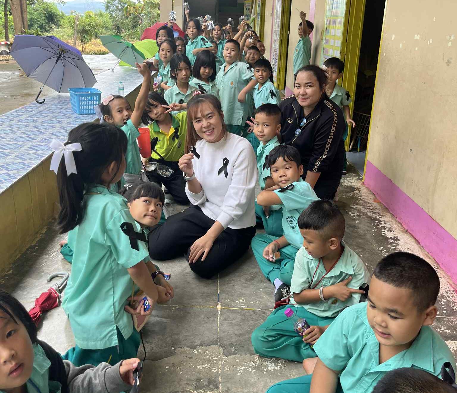 ว่าที่ รต.หญิงชนิสรา ขว้างทา มอบริบบิ้นไว้อาลัยให้นักเรียนโรงเรียนบ้านแม่เทย