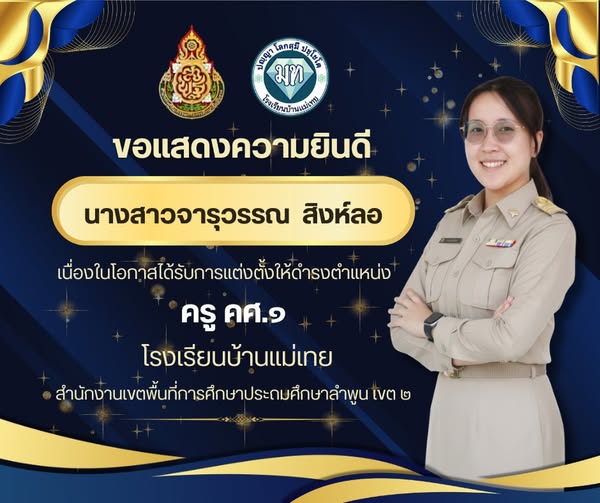 ขอแสดงความยินดีกับ คุณครูจารุวรรณ สิงห์ลอ เนื่องในโอกาสได้รับการแต่งตั้งให้ดำรงตำแหน่ง ครู คศ.1
