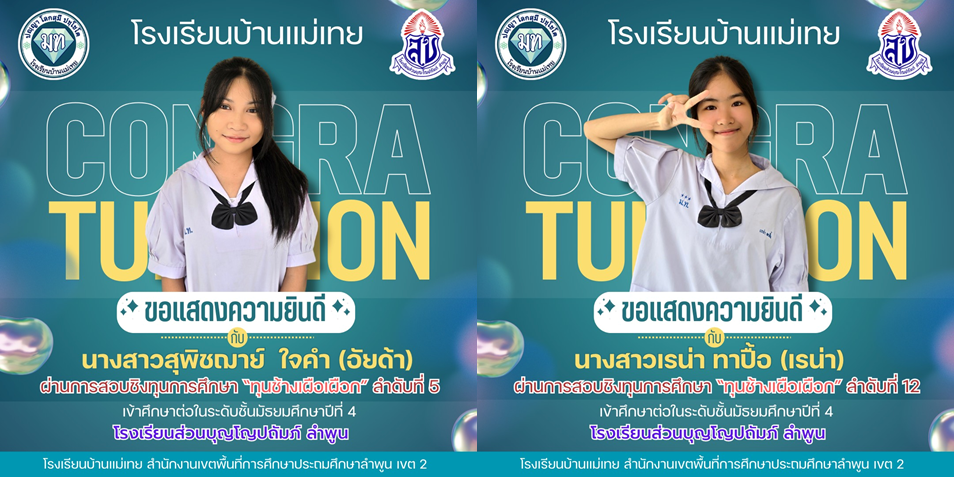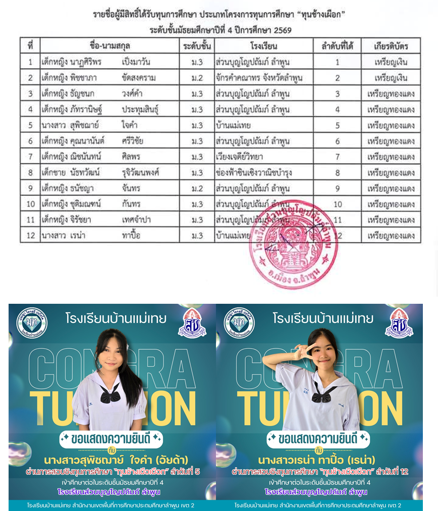 ?โรงเรียนบ้านแม่เทย ขอแสดงความยินดีกับนักเรียนคนเก่งที่ผ่านการสอบชิงทุนการศึกษา?ทุนช้างเผือเผือก? โรงเรียนส่วนบุญโญปถัมภ์ ลำพูน