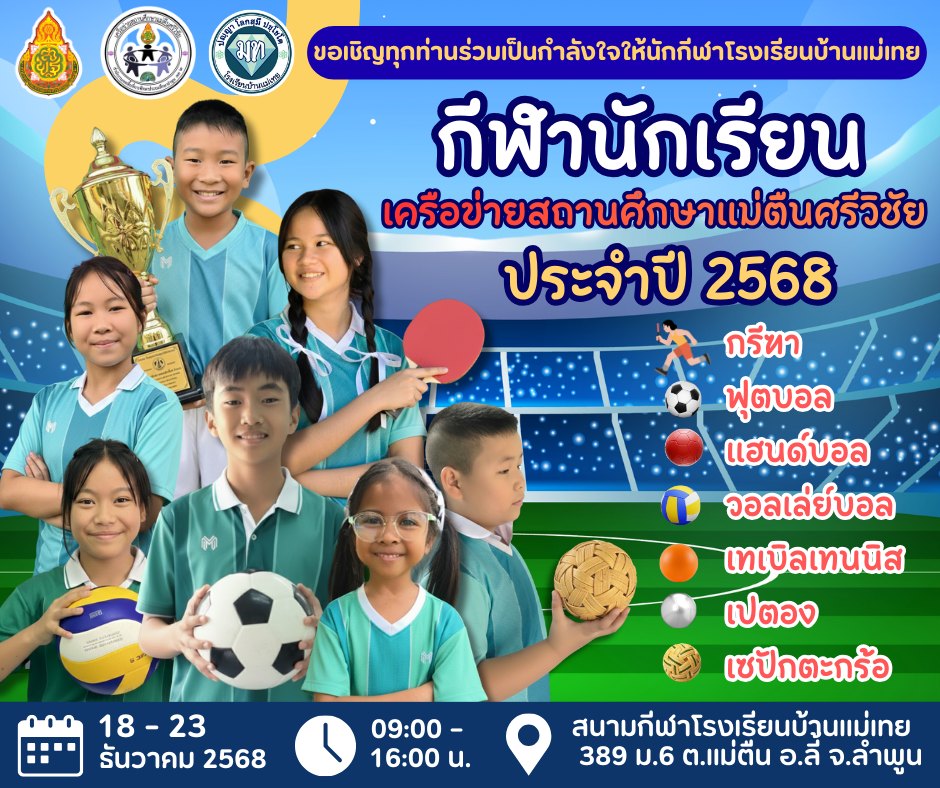 ขอเชิญทุกท่านร่วมเป็นกำลังใจให้นักกีฬาโรงเรียนบ้านแม่เทย ในการแข่งขันกีฬานักเรียนเครือข่ายสถานศึกษาแม่ตืนศรีวิชัย ประจำปี 2568 ระหว่างวันที่ 18 - 23 ธันวาคม 2568 (หยุดเสาร์ - อาทิตย์) ตั้งแต่เวลา 09.00 - 16.00 น. ณ สนามกีฬาโรงเรียนบ้านแม่เทย