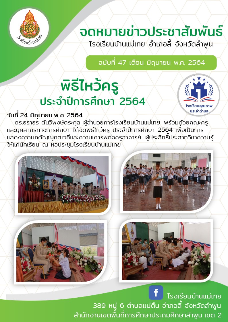 วันที่ 24 มิถุนายน พ.ศ. 2564 ดร.ธราธร ตันวิพงษ์ตระกูล ผู้อำนวยการโรงเรียนบ้านแม่เทย พร้อมด้วยคณะครูและบุคลากรทางการศึกษา ได้จัดพิธีไหว้ครู ประจำปีการศึกษา 2564 เพื่อเป็นการแสดงความกตัญญูกตเวทีและความเคารพต่อครูอาจารย์ ผู้ประสิทธิ์ประสาทวิชาความรู้ให้แก่นักเรียน ณ หอประชุมโรงเรียนบ้านแม่เทย