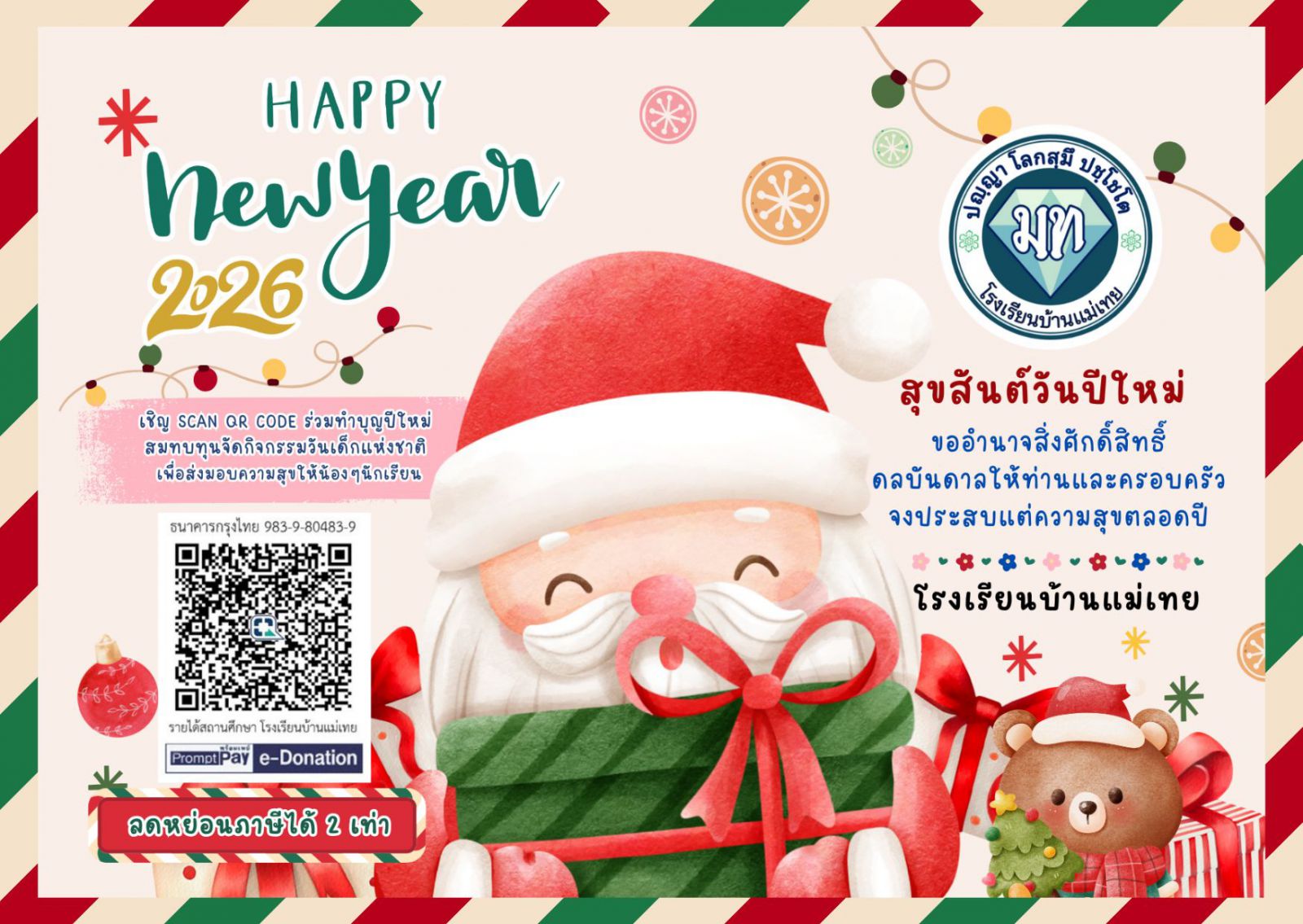 ขอสิ่งศักดิ์สิทธิ์ทั้งหลายในสากลโลกได้โปรดอำนวยพร ให้ท่านและครอบครัว มีความสุขความสำเร็จ และสมหวัง ในสิ่งที่ปรารถนาตลอดปีใหม่นี้ด้วยเทอญ