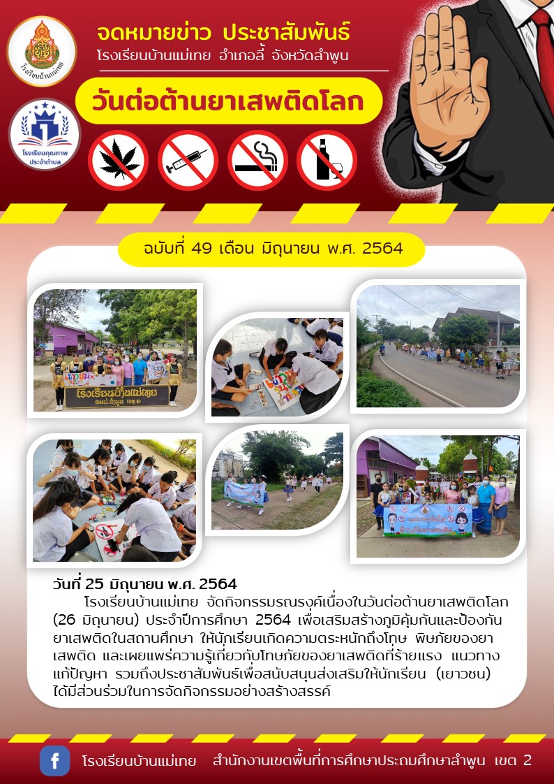 วันที่ 25 มิถุนายน พ.ศ. 2564 โรงเรียนบ้านแม่เทย จัดกิจกรรมรณรงค์เนื่องในวันต่อต้านยาเสพติดโลก (26 มิถุนายน) ประจำปีการศึกษา 2564 เพื่อเสริมสร้างภูมิคุ้มกันและป้องกันยาเสพติดในสถานศึกษา ให้นักเรียนเกิดความตระหนักถึงโทษ พิษภัยของยาเสพติด และเผยแพร่ความรู้เกี่ยวกับโทษภัยของยาเสพติดที่ร้ายแรง แนวทางแก้ปัญหา รวมถึงประชาสัมพันธ์เพื่อสนับสนุนส่งเสริมให้นักเรียน (เยาวชน) ได้มีส่วนร่วมในการจัดกิจกรรมอย่างสร้างสรรค์
