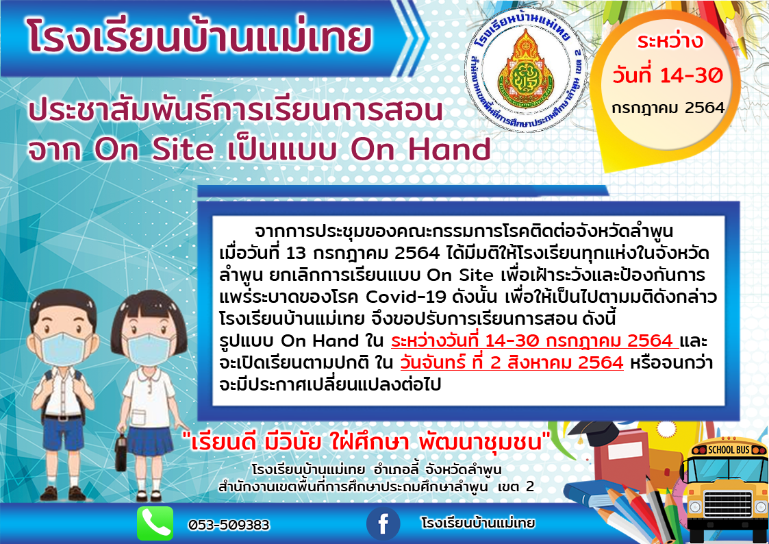 จากการประชุมของคณะกรรมการโรคติดต่อจังหวัดลำพูน เมื่อวันที่ 13 กรกฎาคม 2564 ได้มีมติให้โรงเรียนทุกแห่งในจังหวัดลำพูน ยกเลิกการเรียนแบบ On Site เพื่อเฝ้าระวังและป้องกันการแพร่ระบาดของโรค Covid-19 ดังนั้น เพื่อให้เป็นไปตามมติดังกล่าวโรงเรียนบ้านแม่เทย จึงขอปรับการเรียนการสอน ดังนี้