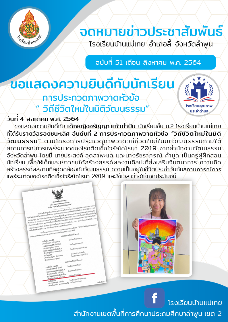 วันที่ 4 สิงหาคม พ.ศ. 2564 ขอแสดงความยินดีกับ เด็กหญิงอรัญญา แก้วคำปัน นักเรียนชั้น ม.2 โรงเรียนบ้านแม่เทย ที่ได้รับรางวัลรองชนะเลิศ อันดับที่ 2 การประกวดภาพวาดหัวข้อ “วิถีชีวิตใหม่ในมิติวัฒนธรรม” ตามโครงการประกวดภาพวาดวิถีชีวิตใหม่ในมิติวัฒนธรรมภายใต้สถานการณ์การแพร่ระบาดของโรคติดเชื้อไวรัสโคโรนา 2019 จากสำนักงานวัฒนธรรมจังหวัดลำพูน โดยมี นายประสงค์ อุดสาพะแล และนางรัชราภรณ์ คำมูล เป็นครูผู้ฝึกสอนนักเรียน เพื่อให้เด็กและเยาวชนได้สร้างสรรค์ผลงานศิลปะที่ส่งเสริมจินตนาการ ความคิดสร้างสรรค์ผลงานที่สอดคล้องกับวัฒนธรรม ความเป็นอยู่ในชีวิตประจำวันกับสถานการณ์การแพร่ระบาดของโรคติดเชื้อไวรัสโคโรนา 2019 และใช้เวลาว่างให้เกิดประโยชน์