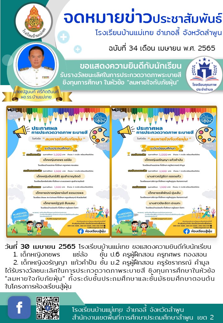 ขอแสดงความยินดีกับนักเรียน รับรางวัลชนะเลิศในการประกวดวาดภาพระบายสีชิงทุนการศึกษาในหัวข้อ "ลมหายใจกับภัยฝุ่น"