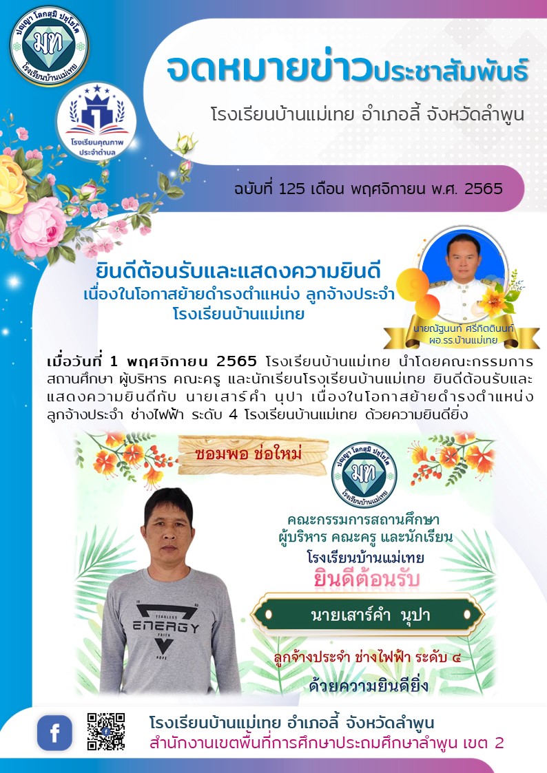 เมื่อวันที่ 1 พฤศจิกายน 2565 โรงเรียนบ้านแม่เทย นำโดยคณะกรรมการสถานศึกษา ผู้บริหาร คณะครู และนักเรียนโรงเรียนบ้านแม่เทย ยินดีต้อนรับและแสดงความยินดีกับ นายเสาร์คำ นุปา เนื่องในโอกาสย้ายดำรงตำแหน่ง ลูกจ้างประจำ ช่างไฟฟ้า ระดับ 4 โรงเรียนบ้านแม่เทย ด้วยความยินดียิ่ง